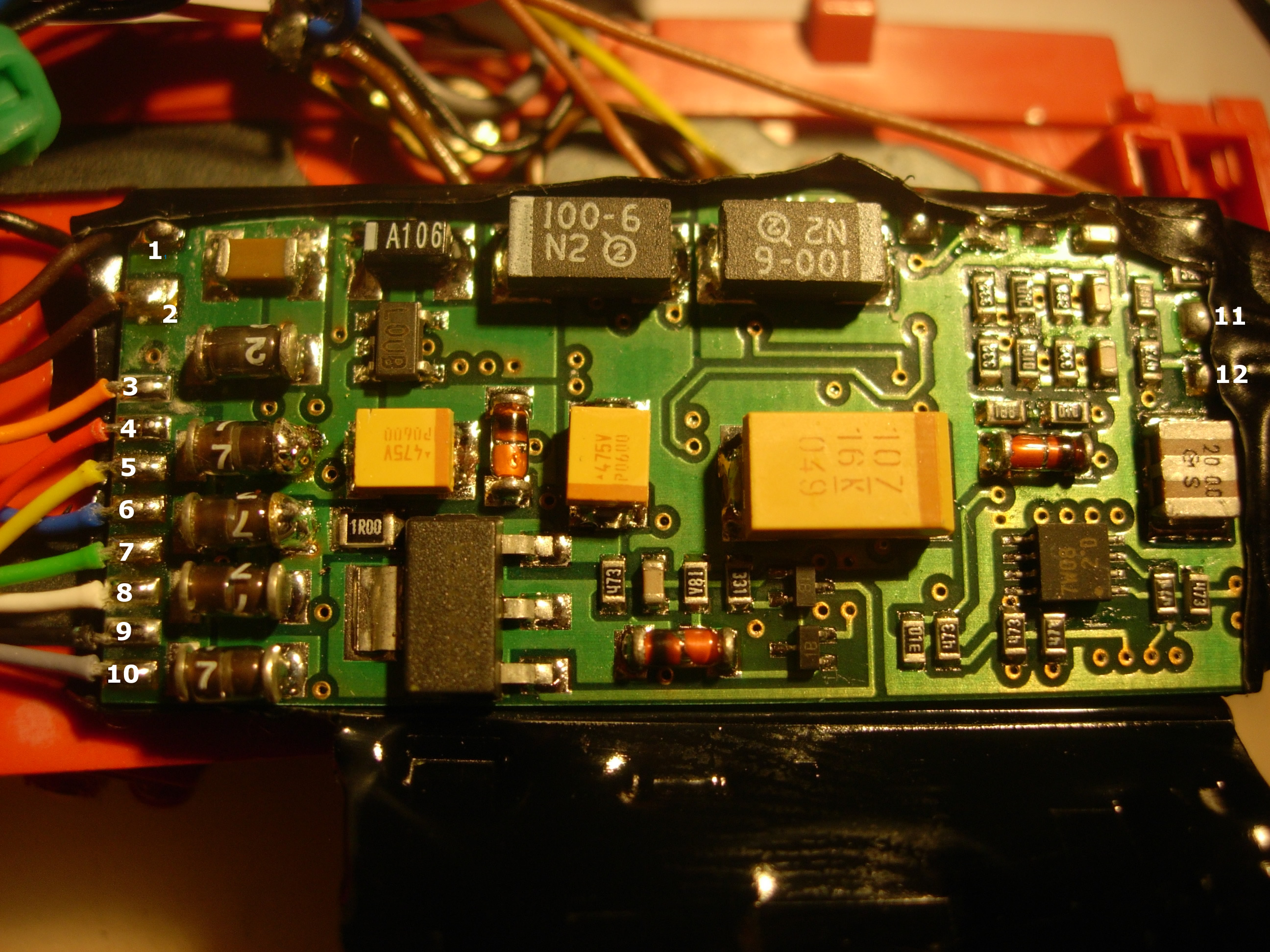 Der Loksound 2 mit geöffnetem Schrumpfschlauch. Die Bestückung kann sich je nach Version leicht unterscheiden. Achtung beim berühren der Elektronischen Bauteile und Leiterbahnen. Der Lötkolben und sich selbst sollten geerdet sein um Statische entladungen auf den Decoder zu vermeiden. |