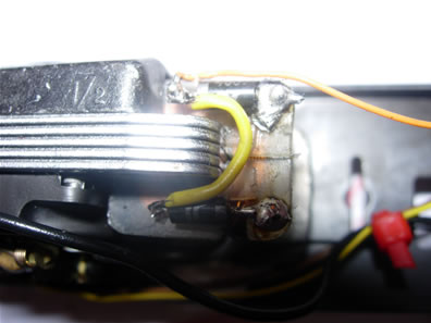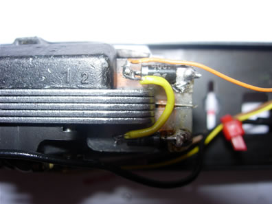| Die zwei Dioden die die Stromrichtung bestimmen an der Feldspule. Diese sind so flach wie nur möglich direkt mit den Feldspulenanschlüsse verlötet. Dies ist nötig damit die Dioden keinesfalls in Berührung mit dem Lokgehäuse kommen. | ![]() |